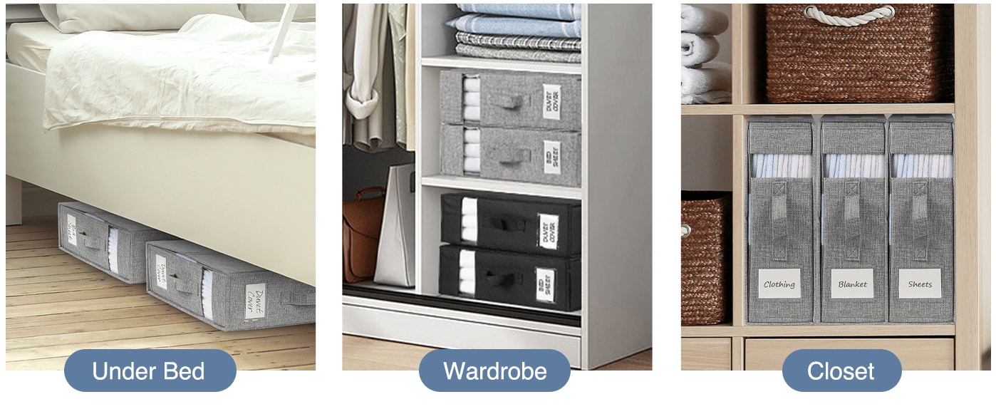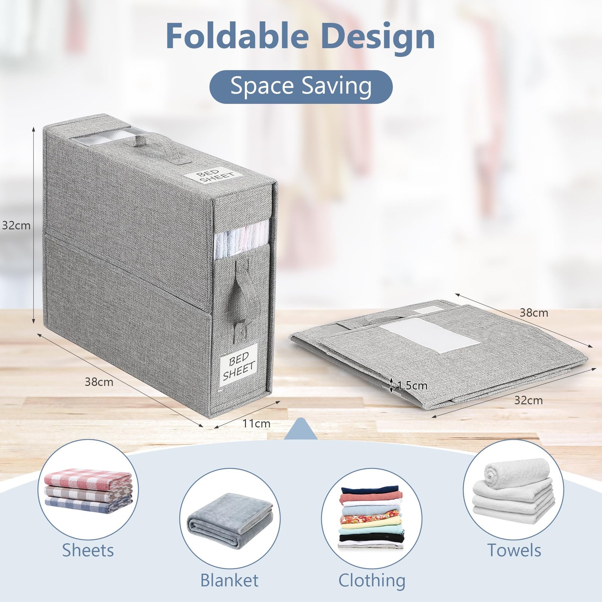 Widely Use: Our storage bins can be widely used for linen closet, wardrobe, cabinet, shelf, under bed, under sofa, or in other place to organizing projects. Itâs simple, convenient and practical to operate, keeping the bedding neat and orderly. The sheets will stay in place and easy to find without wasting more time searching and folding over.