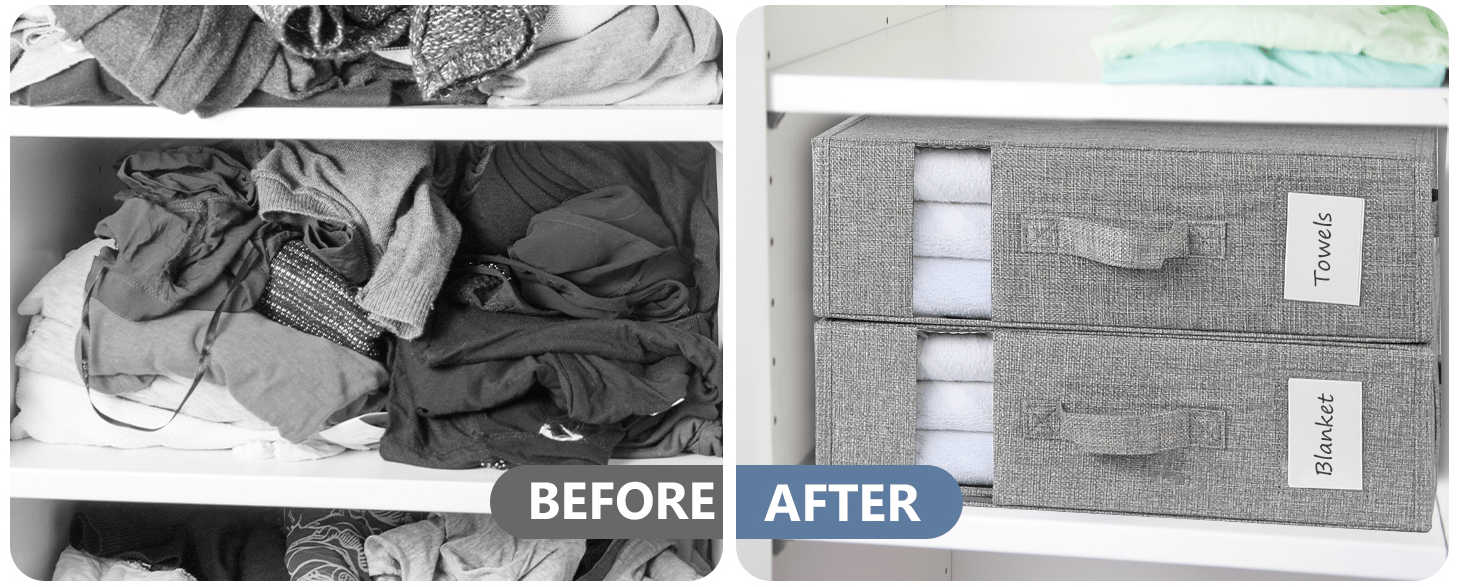 The storage organizer boxes are designed with labels, visual windows and handles on 2 different sides, thus to fit various cabinet height space. You can see at a glance what you are looking for among the many items, making it easy to access and take out the bed sheet or clothing.